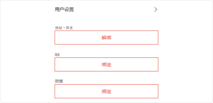 新增绑定第三方账号模块,手机注册的用户都可绑定绑定微信、微博、qq账号,作为自己的第三方登录账号。而使用第三方登录的账号。若开启“首次登录绑定账号”,在未绑定手机号的情况下则会跳转到绑定手机号界面。