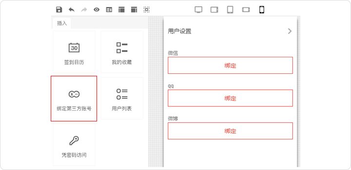 2.使用绑定第三方账号您可以在后台 > 页面 > 新建页面 > 组件 > 绑定第三方账号,将绑定第三方找拖入页面中使用。如图所示,