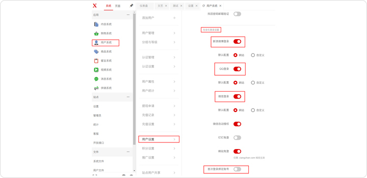 1.在使用首次登录绑定账号功能需要在后台 > 系统 > 用户系统 > 用户设置 > 社会化登录设置操作开启微信、微博、qq账号登录入口,并开启首次登录绑定账号。如图所示。