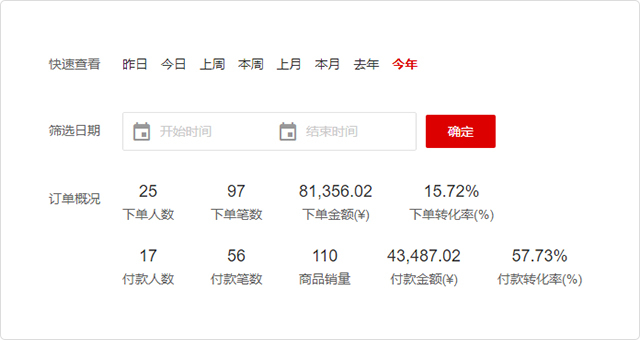 2.1、订单统计可快速查看时间范围内的下单人数、下单笔数、下单金额、下单转化率;