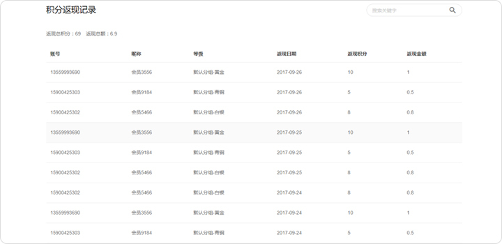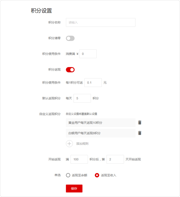 概述用户系统新增积分返现。积分返现是设置用户积分达到一定数量以后进行返现的功能。 作用积分返现可针对用户分组等级进行不同的设置。如设置每积分可返0.1元,每天返还10积分,则对应等级用户将的积分余额将每天减少10积分,用户的余额(不可提现)或收入(可提现)将增加1元的入账。 每天返现的积分都将记录在“积分返现记录”中。 操作用户系统>积分设置>开启积分返现