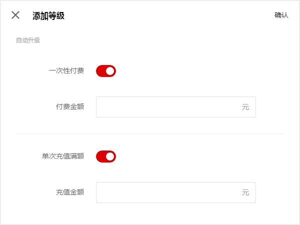 单次充值满额为用户为自己的账户充值满足对应等级设置的金额即可升级至对应等级。注:管理员在后台为用户充值时,如达到对应金额该用户也会成功升级。