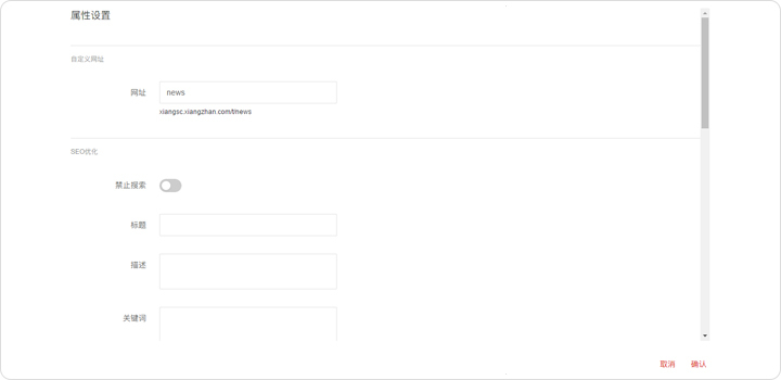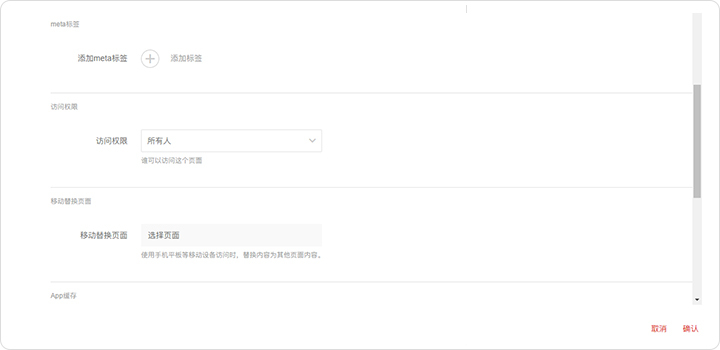 更新后的页面新增属性设置。内容:自定义网址、SEO优化、meta标签、访问权限、移动替换页面、客服设置和禁止搜索,进行了统一归纳,以后的内容将优化不再显示,如图所示