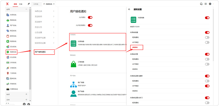 在【消息系统】,“用户接收通知”中点击’内容系统—内容消息’,在弹出的【通知设置】窗口中,选择要设置的模板,点击’编辑模板’,进入【模板编辑】窗口。 如下图。