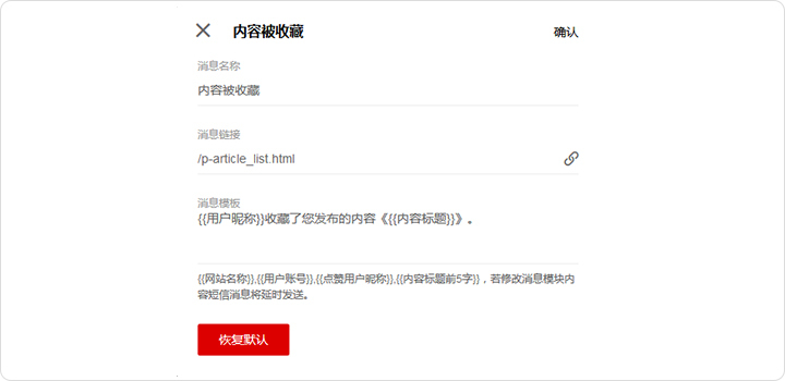 在【模板编辑】窗口中,编辑消息名称(发送给用户的消息名称)、消息链接(用户接收到的消息的附带链接,用户点击进入消息详情)、消息模板(用户接收到的消息内容模板)点击【确认】按钮完成编辑。【恢复默认】按钮:点击后消息模板内容还原为默认设置;下方提示信息为消息模板内容填写格式。 如下图。