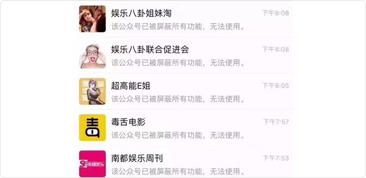 6月9日晚,又有包括金融八卦女、娱乐圈扒姐、深八影视圈等多个公众号停止服务,目前点击上述账号发布的历史文章,均显示:此内容被多人投诉,相关的内容无法进行查看。