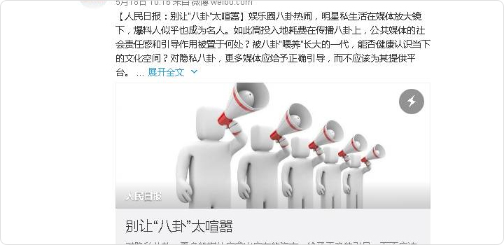 而在关闭账号之前,事情似乎早有预兆,人民日报此前曾痛批八卦:5月18号,人民日报曾微博发博:【别让“八卦”太喧嚣】,曾表示媒体不应为八卦推波助澜、被“八卦”喂养长大的一代,能否健康认识当下的文化空间?有知情人透露,此次封号和该刊文有关。