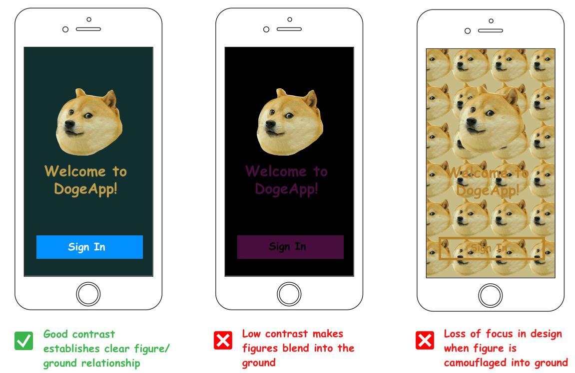 通常来说,背景是指主体(目标)存在于背景上面的(当物体重叠时,通常把小的看作背景之上的主体)。目的是保持注意力在这个主体上并且能明显的区别于所在背景。利用高对比度的颜色设计将会建立强烈的主体/背景关系,当然,低对比度的颜色将会削减他们之间的关系。新人设计页面时,应该保持背景的简洁(可适当运用浅纯色或细微纹理)并且目标不要运用过多种颜色。