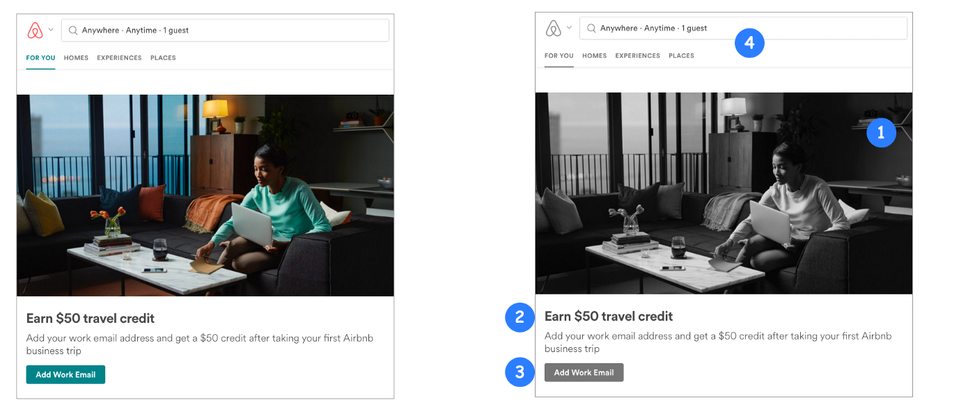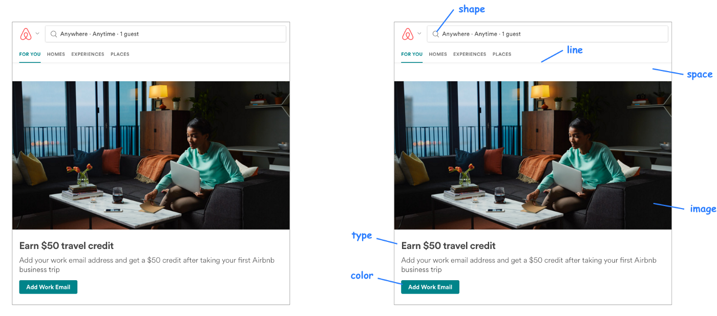 视觉分层系统是建立在组成部分合理安排的基础上,优先显示的信息在前,次要的信息在后。这会经常作为一个练习 — 在商业目标下权衡用户的需求。对于Airbnb来说,商业目标就是当用户需要寻找地方去住时,去让用户创建一个关联的账户。换句话说,在页面上商业目标胜过用户所需。