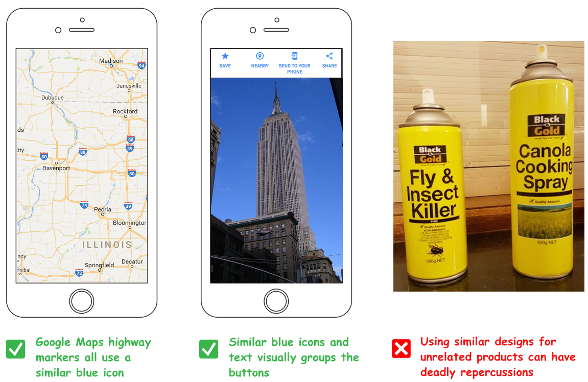 相似的物体会被认为是相关的。相似的物体可以拥有相同的颜色,形状,尺寸大小,或是朝着相同的方向。运用相似性原理可以使相关的物体产生紧密的关联性。
