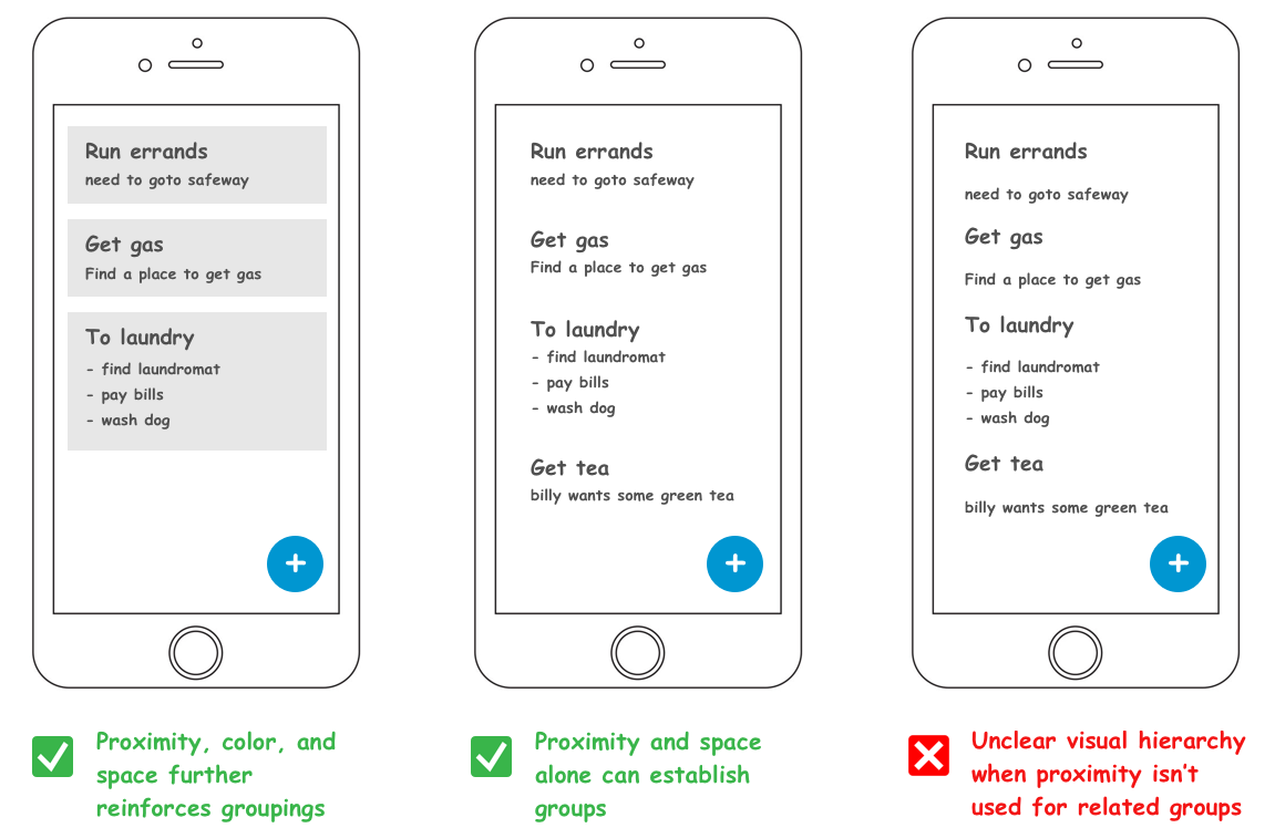 在视觉上,利用接近性可以将目标分组。可以结合运用颜色使分组更明确。与接近性相反,空间留白,也可以加强分组或是隔离不相关的元素。