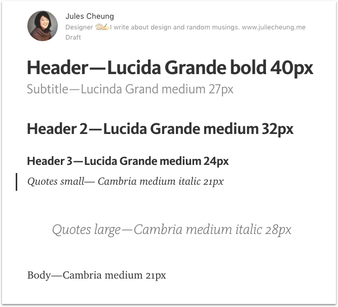 经验告诉我们,用一种标题主题字体和另一种字体作为内容主体字体,但在一个页面布局中最好不要多于2到3种字体。一般来说,标题或类型越多(引用,链接等),你就需要运用更多的字体。下图所示的例子,是运用2种不同的字形系统中(Lucida Grande and Cambria) 的7种字体。
